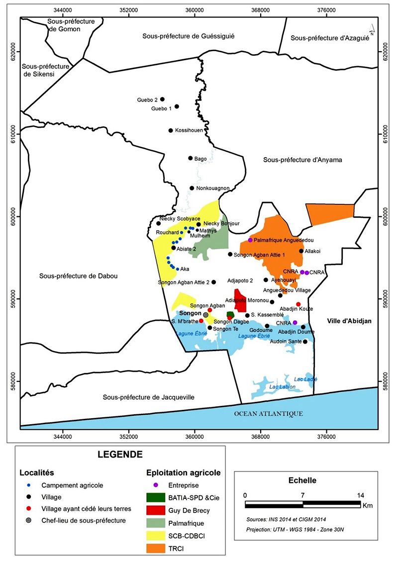 This article reports on research aimed at analyzing the different modes of access to land by public and private operators (purchase, rental, inheritance and long-lease concessions), who manage large farms in Songon Subprefecture. This is exploratory research into little-studied rationales, even though these lands are the subject of a number of claims in this area on the fringes of the Abidjan metropolitan area. A method combining documentary research and field surveys was adopted. Documentary research was carried out on the premises of the Songon branch of the Côte d’Ivoire Ministry of Agriculture and the Agence Nationale d’Appui au Développement Rural (ANADER ; National Agency to Support Rural Development). The initial information provided by this structure and observations in the field enabled us to inventory these large farms and the village(s) to which they belong. Meetings and interviews were also held with farm managers, company agents, and customary authorities in the surrounding villages—in particular Abadjin-Kouté, Songon-Kassemblé, Songon-Dagbé, Abiaté, and Nonkouagon.