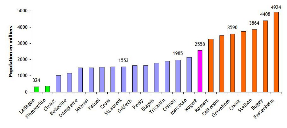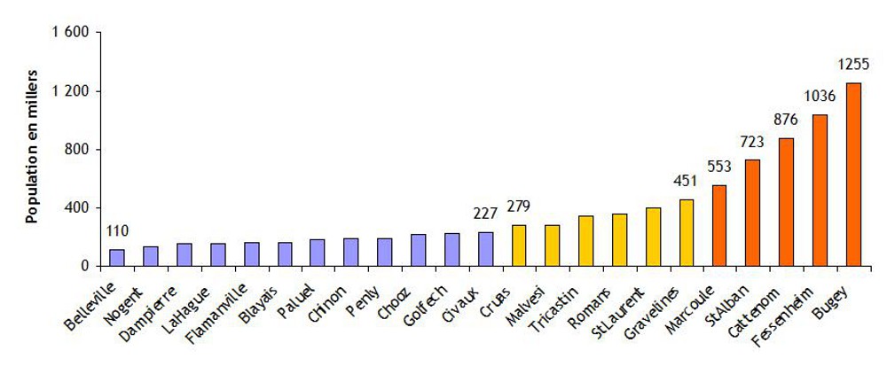 De même, la population dans un rayon de 30 km (figure 1) est relativement faible pour une moitié des sites (moins de 250 000 habitants). Quatre sites se distinguent avec plus de 500 000 habitants et des ensembles urbains importants : le Bugey (Lyon est à une trentaine de kilomètres), Fessenheim (Fribourg à 20 km, Mulhouse à 25 km), Cattenom (Thionville et Luxembourg, respectivement à 10 km et à 22 km) et Saint-Alban.