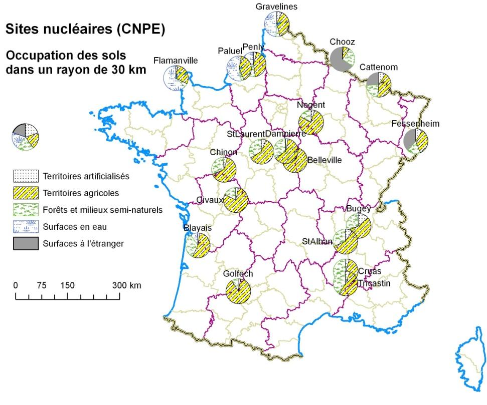 Une approche complémentaire pour apprécier la variabilité des coûts liés à l’hypothétique contamination des territoires avoisinant les sites nucléaires consiste à étudier l’occupation des sols, par exemple dans un rayon de 30 km.