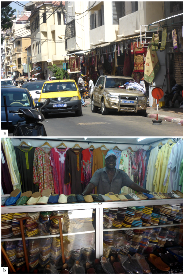 Other Dakar markets are supplied by road from Mauritania and Morocco, and are the final destination for products crossing the Senegal River from north to south. The shops on Rue Mohamed V in the Plateau district are a perfect example (Figure 4). Run by families living between Morocco and Senegal, they offer Moroccan products : clothes, leather shoes, prayer mats, handicrafts, etc., but also Turkish products, imported via Morocco.