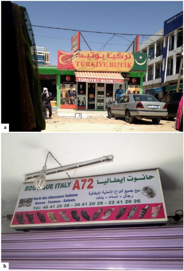 In Nouakchott, links with Morocco but also with Dakar are important and visible in the main markets. At both the Capitale and Cinquième Markets, many European-style men’s clothing comes from Morocco by road, indicating that products made in China are being re-exported from this country. Some shops highlight other sectors, Turkish or Italian (Figure 5). Links with Dakar are also important, particularly in the Cinquième Market, where the majority of traders and customers are West African (Choplin 2009) : wax, fabrics made in China or Europe, but also shoes made in China, are partly purchased in the Dakar markets (Figure 6). Other sectors directly supply the port of Nouakchott and wholesalers in the Sixième Market with “Chineseries,” often via the port of Dubai. Finally, Moroccan refrigerated trucks are also visible in the wholesale food market of the “Moroccan mosque” in the center of Nouakchott. The supply chains therefore intersect in the Nouakchott markets, again pointing to trade links between Morocco, Mauritania and Senegal, and further afield with Europe and Asia.