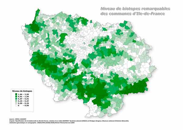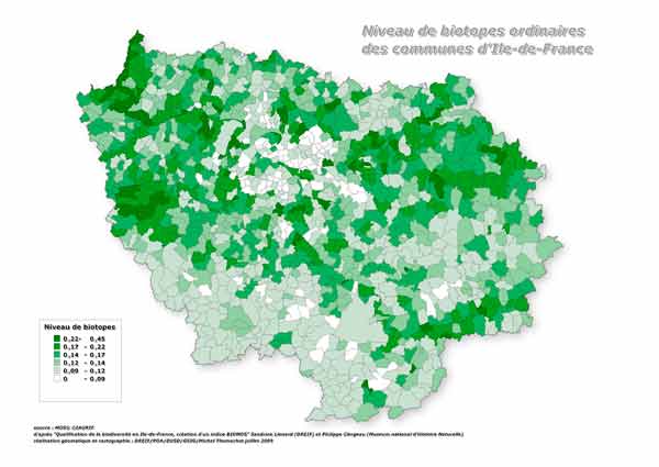À titre d’illustration, l’enjeu de la biodiversité donne lieu à l’une des douze lignes d’action et indicateurs « d’ @d aménagement durable ». En l’absence de données publiques robustes, la seule démarche disponible est l’inventaire effectué par des naturalistes, commune par commune. Cette action demande environ un an par commune. Inspirée de la démarche de la ville de Paris, la méthode retenue pour la fabrication de l’indicateur « @d biomos » permet de mesurer le potentiel de biodiversité des biotopes de la commune. L’Île-de-France a développé ces 25 dernières années un Système d’Information Géographique, le MOS (Mode d’Occupation des Sols), qui décrit en 83 postes les différents modes d’occupation des sols. Il a été paramétré sous la forme de 25 postes de potentiel de biodiversité. Ce travail, mené par des naturalistes de la DRIEA et du Muséum national d’Histoire naturelle, a conduit à distinguer l’enjeu de la biodiversité remarquable, sous contrôle en France, de celle de la biodiversité ordinaire, aujourd’hui laissée pour compte. Deux cartes de l’Île-de-France ont pu ainsi être produites. Elles sont d’une lecture immédiate par les élus, les services, ainsi que par les habitants et les entrepreneurs locaux.