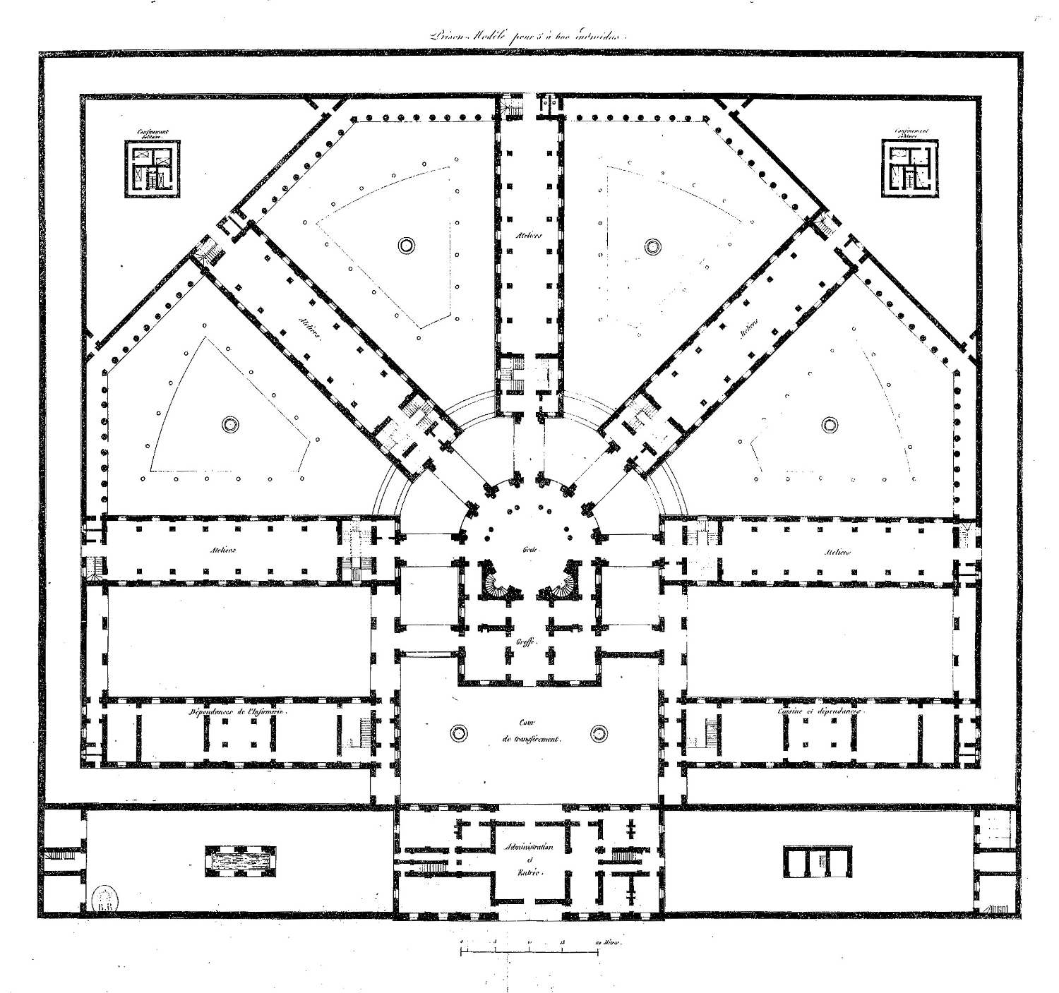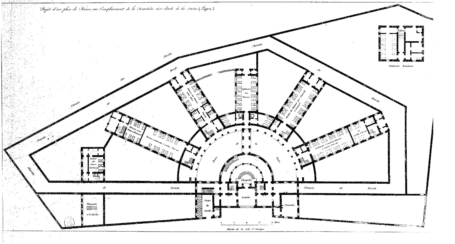 Au cours du premier tiers du XIXe siècle, de nombreux projets de prison sont conçus qui entendent rompre avec l’Ancien Régime, au nom d’une pensée nouvelle de la pénalité. En effet, la prison d’Ancien Régime apparaît aux yeux des législateurs comme le lieu de la promiscuité, d’un mélange indu des catégories de détenus, fait d’injustice et d’arbitraire (Petit 1995). Les politiques révolutionnaires puis impériales modifient en profondeur le système judiciaire, notamment par sa réorganisation à l’échelle territoriale, conjuguée à l’ambition de punir grâce à une réforme des sanctions qui doivent remplacer les punitions royales considérées comme iniques [6]. Ce changement d’objectif pénal fait du recours à l’incarcération la peine principale.