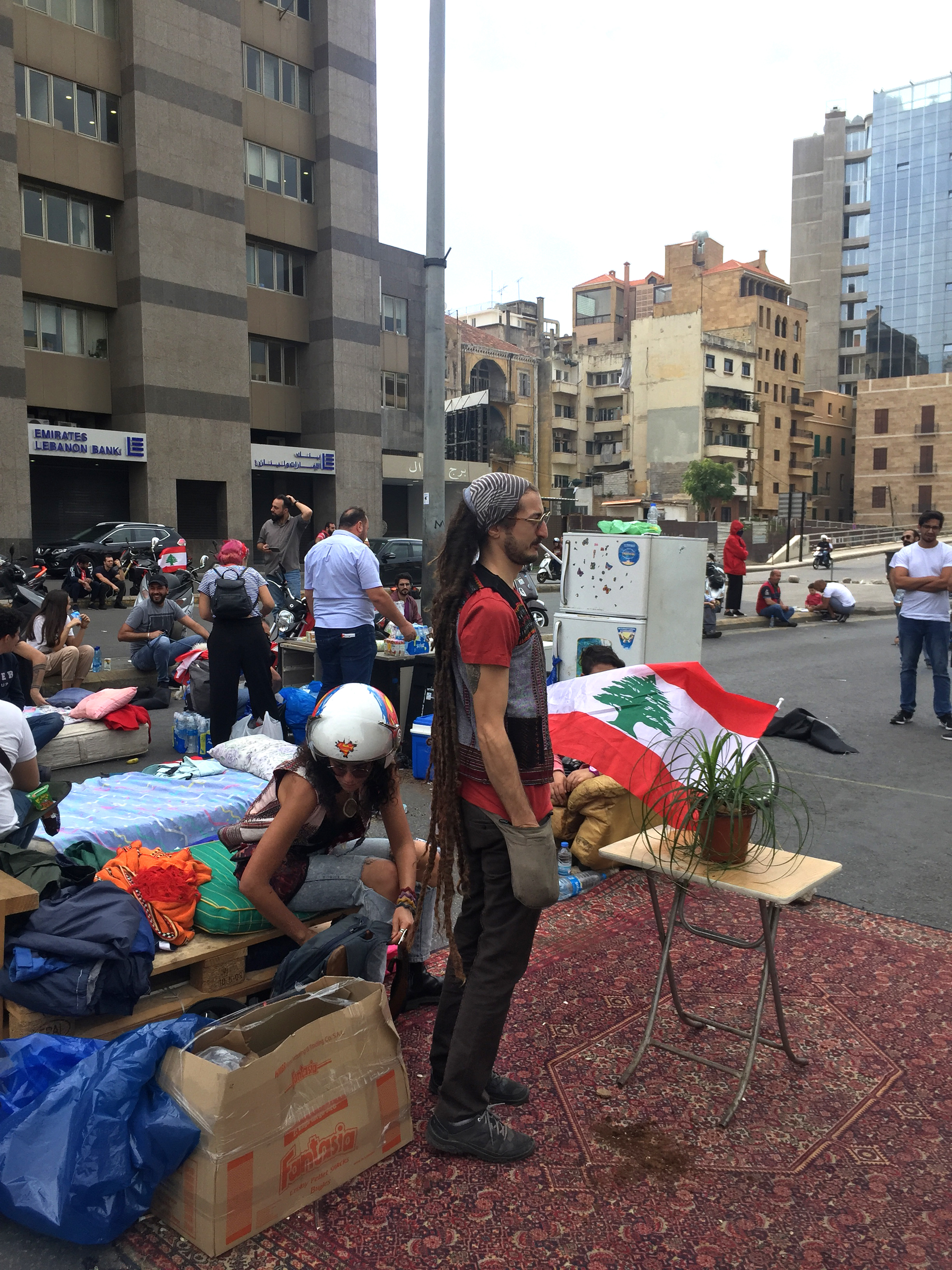 Ensemble, on investit aussi les bancs, les marches, les trottoirs, la cour intérieure de l’immeuble Lazarieh datant de la période moderne, le mémorial de Rafic Hariri, la place des Martyrs, les souks… Les manifestants sont en revanche tenus éloignés de la place de l’Étoile où siège le Parlement, les militaires en bloquant tous les accès. Qu’importe, ensemble les Libanais redécouvrent ce centre-ville, se l’approprient, l’investissent, certains, peut-être, pour la première fois. Les marchands ambulants déambulent : café, maïs, galettes de pain au sésame, jus de fruits frais… depuis quand n’a-t-on pu déguster un café pour 250 LL (25 cents) dans le centre-ville ? À côté des tentes qui accueillent désormais les stands des associations, au cœur de la vitalité de la société civile ces dernières années, même les stands de barbecues se sont installés. C’est aussi ça, le droit à la ville.
