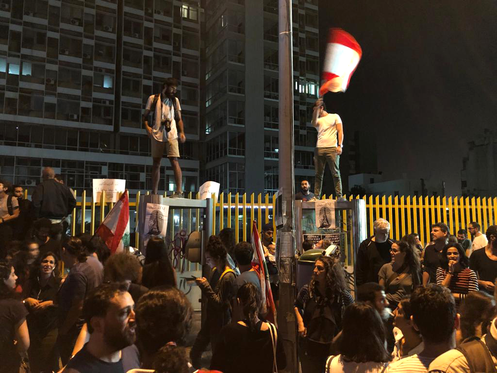 Dans les premiers jours de la contestation, les manifestations se sont concentrées au centre-ville de la capitale : en face du Grand Sérail sur la place Riad el Solh et place des Martyrs. Chacun de ces lieux revêt une importance symbolique. Situé sur une colline, le Grand Sérail est aujourd’hui la résidence du Premier ministre. Le Conseil des ministres y siège [3]. Située en contrebas du Grand Sérail, la place Riad el Solh, qui porte le nom du Premier ministre depuis 1957, a connu plusieurs vies. Lieu de rassemblements où avaient lieu les parades militaires et les marchés aux bestiaux sous l’Empire ottoman, elle a ensuite été transformée en square, pris entre les voies de circulation avec la modernisation de la ville. Depuis la fin de la guerre, la dimension de la place s’est amoindrie. Mal aménagée et peu étendue, elle n’est plus occupée que lors de manifestations, car c’est le point de rassemblement le plus proche du Sérail.