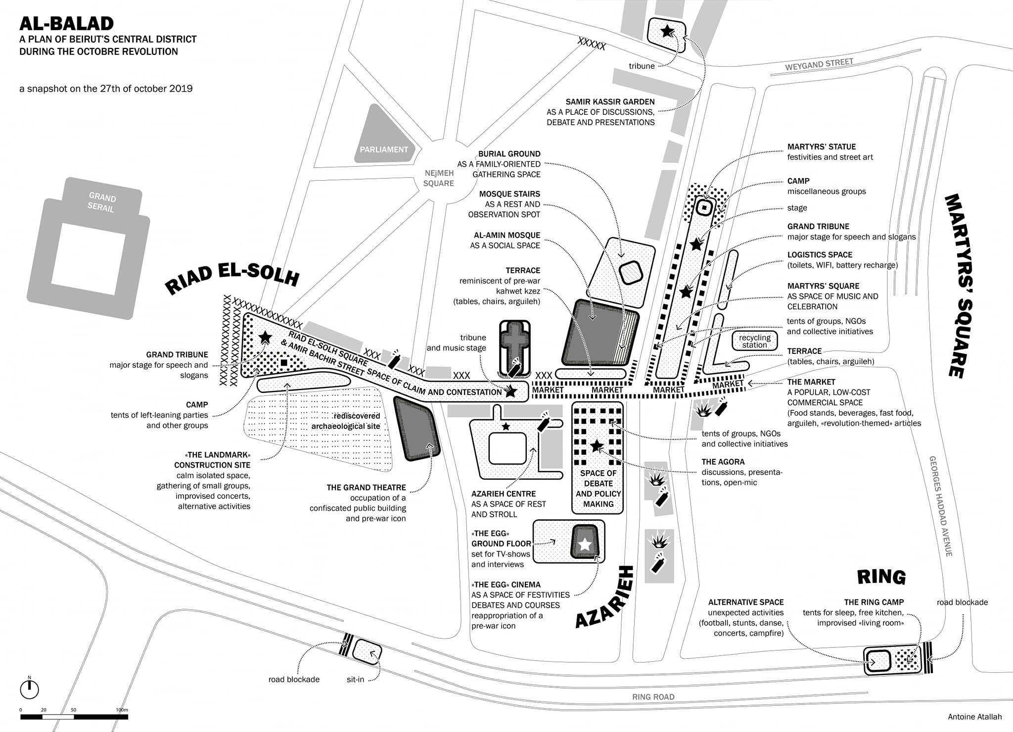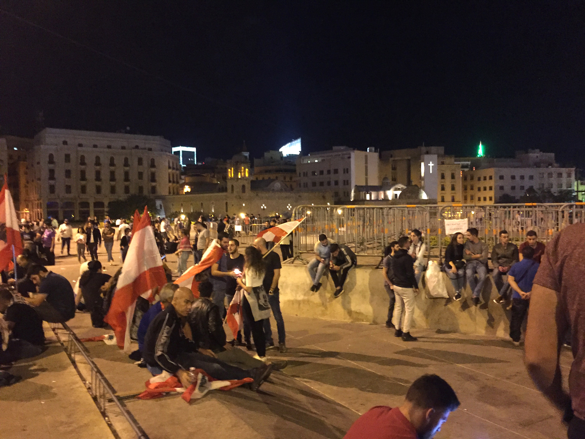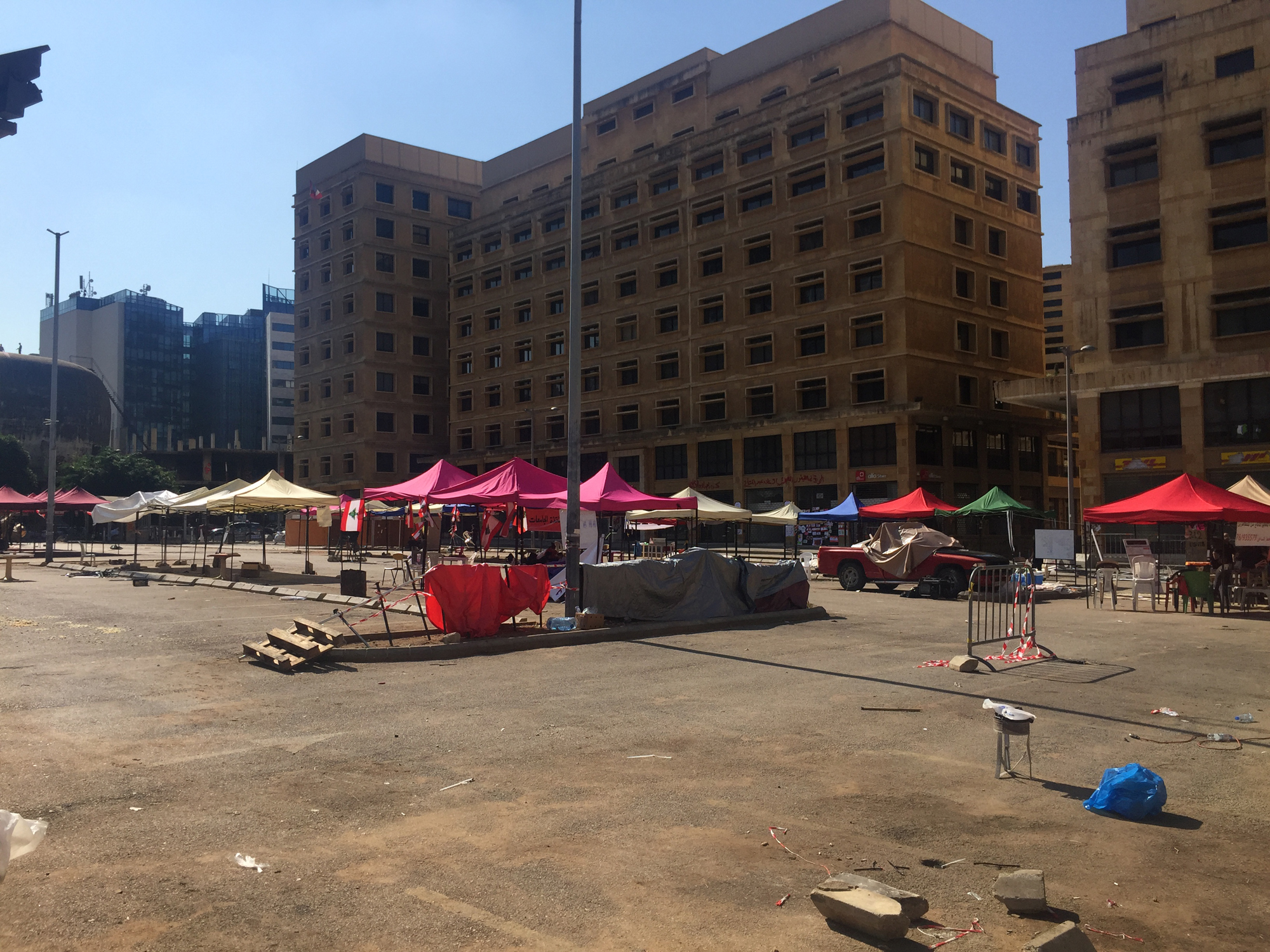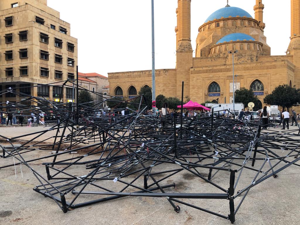 Le 29 octobre, au dixième jour de la contestation, quelques heures avant la démission du Premier ministre Saad Hariri, des casseurs ont fait irruption au centre-ville de Beyrouth et détruit toutes les installations temporaires qui s’y étaient implantées. Une légère réorganisation de l’espace en a suivi : infrastructures plus flexibles, espaces de débats mieux établis, encerclement de tout l’espace des manifestations par des barrières métalliques (installées par les autorités).