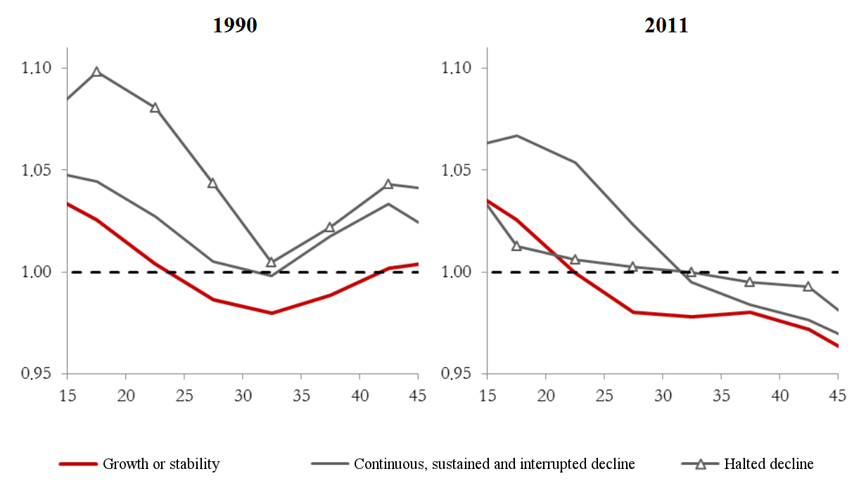 The residential mobility patterns of declining FUAs are also characterized by greater numbers of women aged 15 and over choosing to move away, as attested by the higher ratio of men to women [10] in these cities compared to growing FUAs (figure 10). The fact that more women go into higher education and are more employable in the tertiary sector, on the one hand, and the fact that men are more strongly associated with the industrial component of the labour market, on the other, probably explain how these situations arise. In this respect, the inadequacy of university structures – or, more specifically, the mismatch between the courses on offer and local demand – could be contributing both to the lack of attractiveness of declining cities and the transformation of their demographic structures. In FUAs in halted decline, which in 1990 stood out most from the other area profiles, the sex ratio in the 15–24 age group was very similar, in 2011, to ratios observed in growing FUAs. Accordingly, we can put forward the hypothesis that this gendered dimension can also be found in the process of resurgent demographic growth, as, since 2006, women in the youngest age groups, who previously tended to leave these cities, are more frequently choosing to stay.