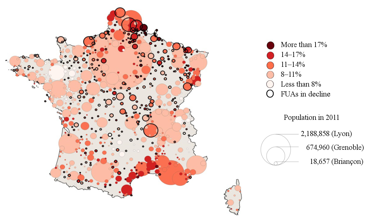 One of the consequences of declining FUAs’ industrial pasts is that their economically active population is composed of a higher proportion of manual workers and, on average, its members have fewer qualifications. In 2011, some 3 out of every 10 people in work in shrinking cities were manual workers, compared to just 2 in 10 in other FUAs. This socio-economic structure is the result not just of these cities’ lack of attractiveness, but also of a selective residential mobility, as young, skilled individuals of working age are more likely to move away than manual labourers (Rudolph 2015).