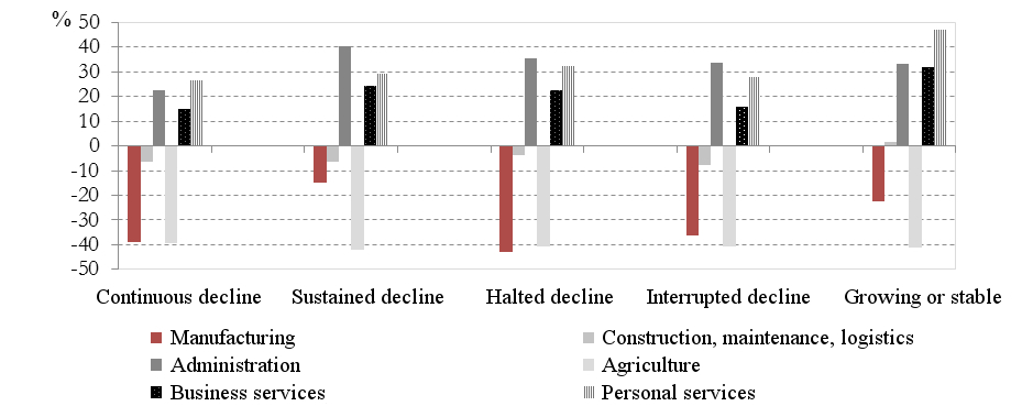 However, despite this slowdown in the industrial sector, the proportion of manufacturing jobs is still higher in these cities than in growing FUAs. For example, in cities with halted decline, the industrial sector still accounts for twice as many jobs as in growing FUAs (16.5% compared with 8.1%), despite a 43% reduction in the total number of manufacturing jobs in France between 1990 and 2011. Jobs in sectors such as construction and public works, transport, logistics, maintenance and repairs, and farming are also overrepresented, whereas sectors like distribution and services are less dynamic. Shrinking FUAs can therefore be characterized by the weakness of their presential economies – including activities such as domestic services and retail intended to meet local demand (Davezies 2009 ; Talandier 2013) [9] – which can be explained, among other reasons, by the greater difficulty involved in attracting those considered to be the drivers of this economy : tourists, retirees and students.