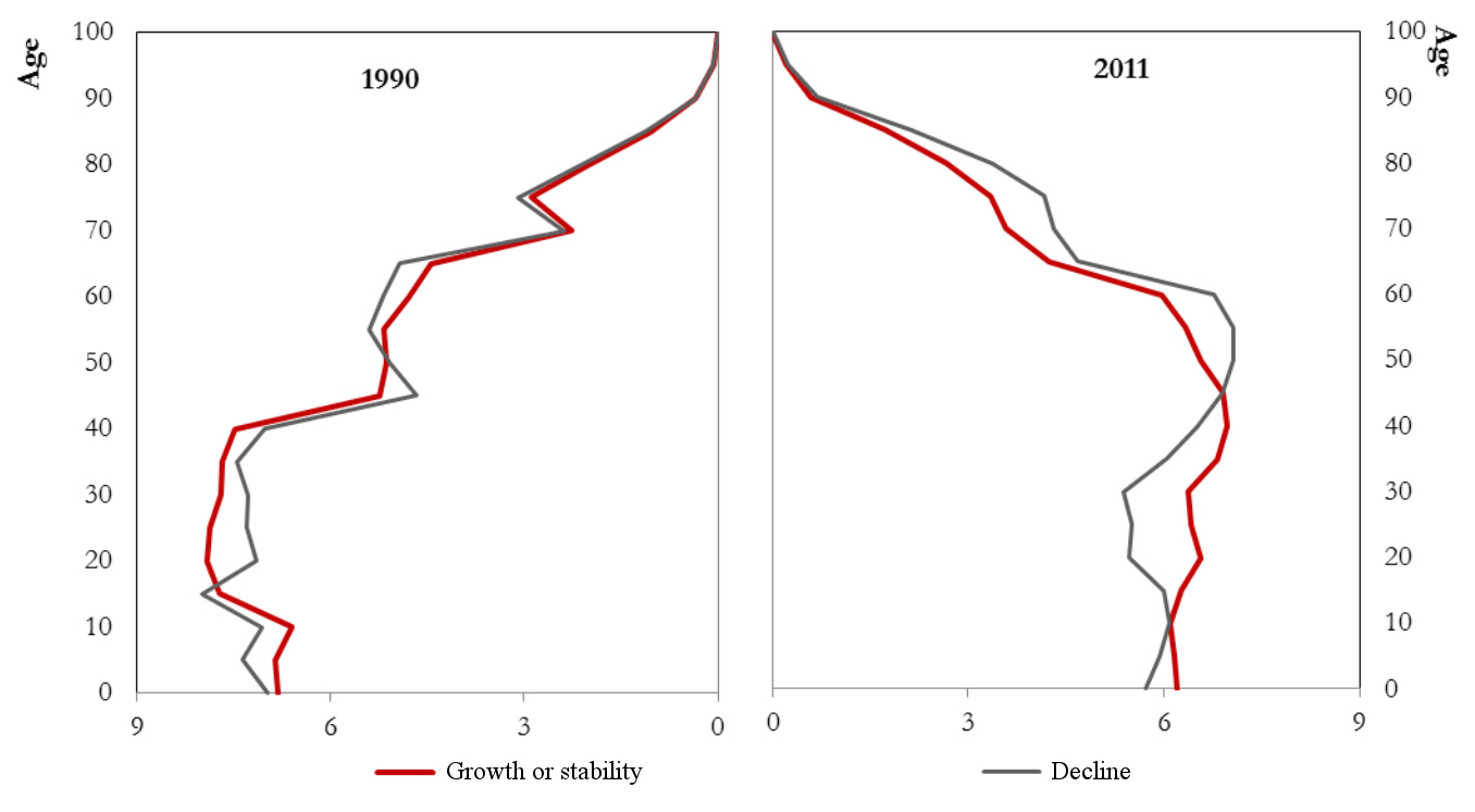 France’s fertility rate, among the highest in Europe (Mazuy et al. 2014), has until now made it possible to contain the phenomenon of urban shrinkage, owing to a positive rate of natural increase, but this specific form of “ageing from the middle” tends to cancel out the effects of this natural increase. This can be observed in all declining FUAs, but the speed of the process is particularly striking in FUAs in sustained decline (figure 9). In these areas, the rate of natural increase dropped from 5.1‰ in 1990 to 2.3‰ in 2011.