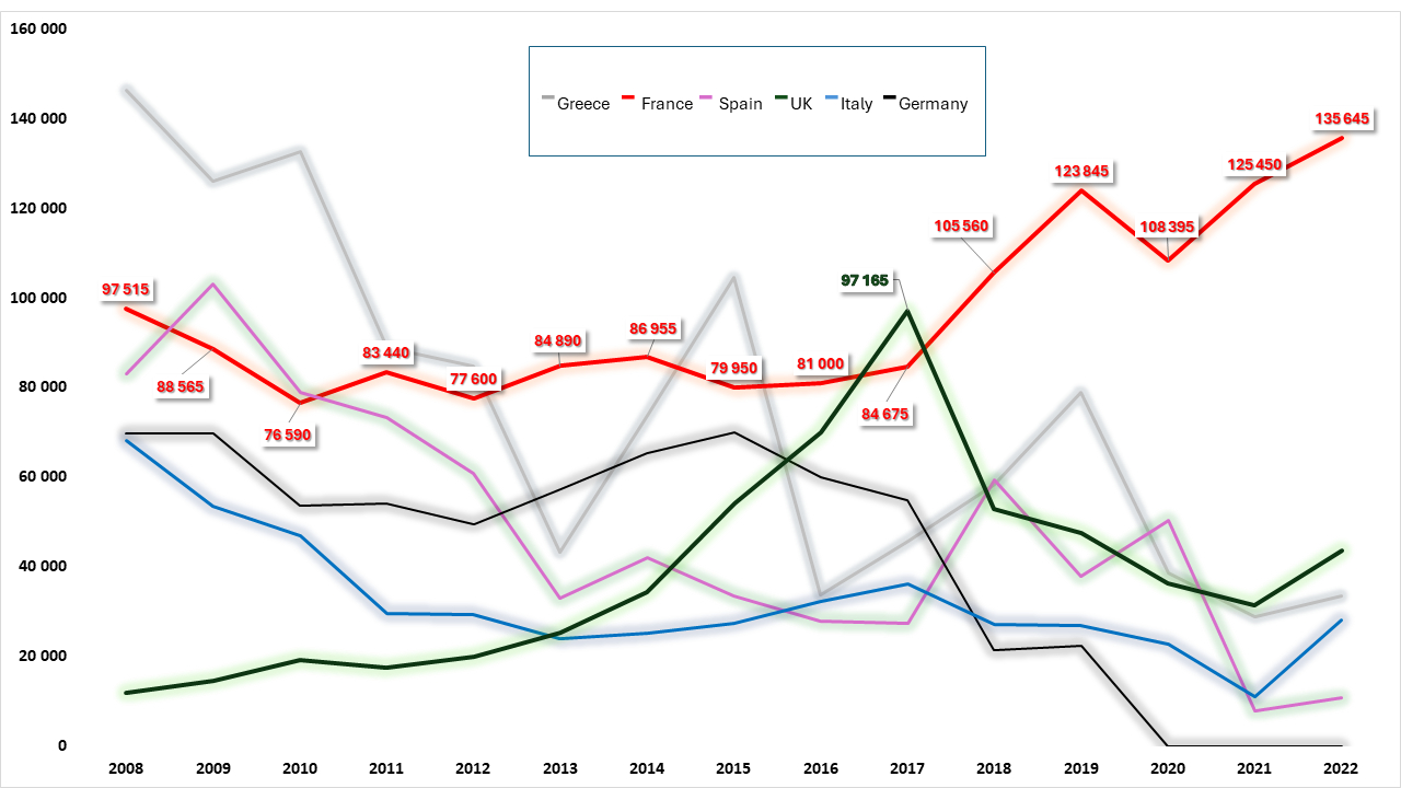 This high administrative productivity, which has risen sharply over the past seven years, is not explained by an increase in the number of arrivals. As Figure 5 shows, each year France delivers far more than the 97,000 orders to leave the territory issued by Germany at its peak in 2017. However, Germany recorded 1.5 million foreign arrivals in 2015, and then over 700,000 in the years that followed. If the ratio between the number of orders to leave the territory and the flow of arrivals were similar in France to the ratio seen in Germany during those “crisis” years, France should have seen almost a million new entries every year. This is clearly not the case : at its peak, the number of non-EU citizens entering France each year was just over 250,000.