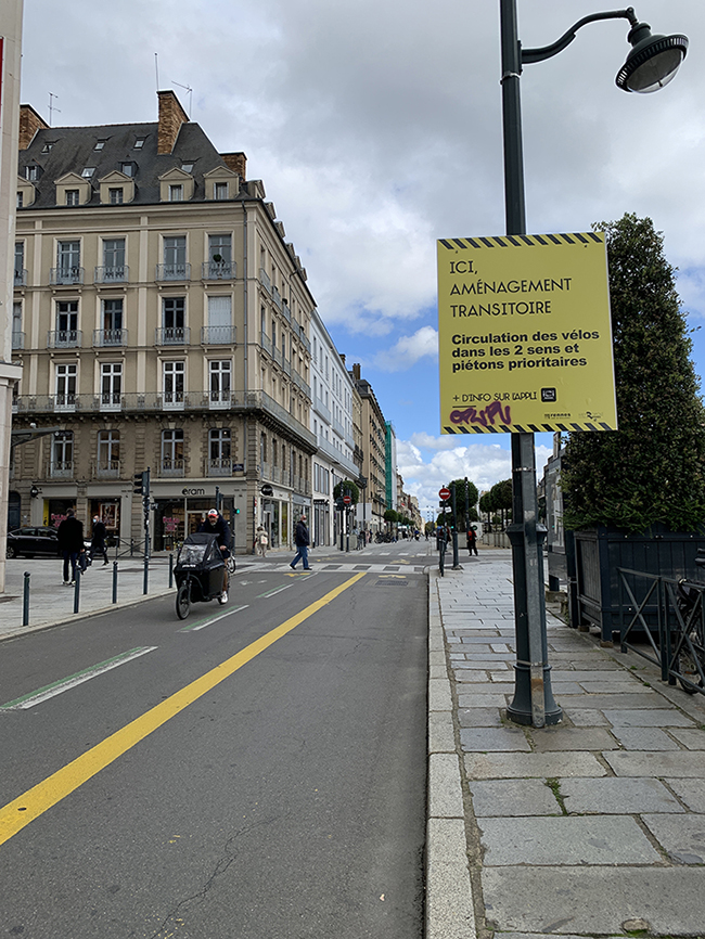Au travers de l’urbanisme tactique cycliste, la crise sanitaire a accéléré la mise en œuvre de projets déjà planifiés. À Rennes, l’aménagement du quai Duguay-Trouin en vélorue était prévu dans le cadre du réseau express vélo. Ce projet a connu une accélération notable grâce aux aménagements cyclables temporaires réalisés pendant la crise sanitaire et pérennisés au sortir de celle-ci (photo 17).