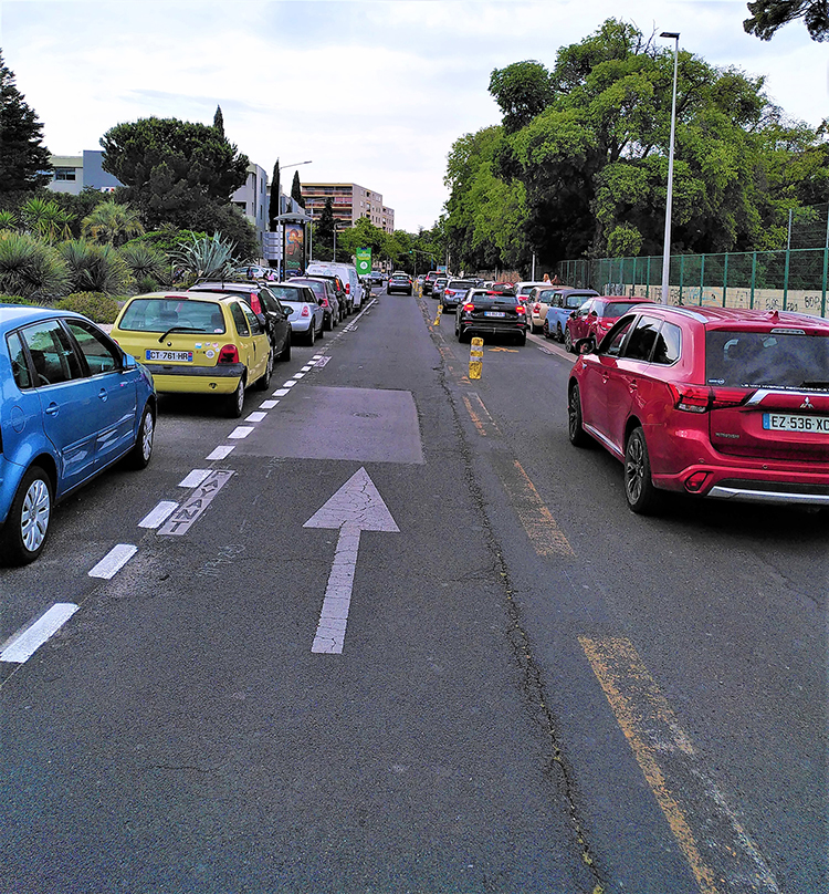 Par manque d’aménagements adaptés, des problèmes de cohabitation entre cyclistes et piétons persistent. À Montpellier, sur l’avenue de Nîmes, les piétons et les cyclistes se croisent dans un espace restreint et parsemé d’obstacles (bordures et potelets), faute de continuité d’itinéraire cyclable sécurisé (photo 12).