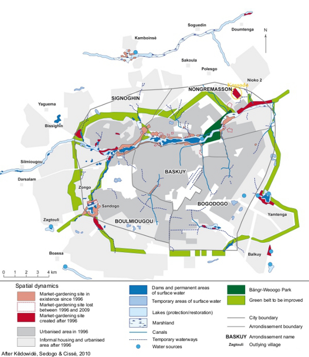 The city of Ouagadougou is a prime example of the opposition that continues to exist between the city and the country, the city and nature, the city and agriculture. Much more significant than any demographic criteria, it is this functional distinction between farming and other activities that is at the heart of the way the city is defined in Burkina Faso. Like other African countries, Burkina experienced rapid and uncontrolled urbanisation in the 1960s and 1970s. Ouagadoudou was the main beneficiary of this growth, essentially the result of rural exodus. Today, while growth has slowed down in large urban areas, instead favouring small and medium-sized towns, the Burkinabè capital continues to expand, informally for the most part. Accordingly, most intra-urban and periurban agricultural spaces are spontaneously developed sites with no right of occupancy. This can be explained by strict legislation (Bagré et al. 2001) that has only recently been relaxed following the adoption of the Schéma Directeur (Master Plan) for Greater Ouagadougou, revised in 2008, which recommended the allocation of wetlands for market gardening and the creation of a green belt to the south of the city. Its guidelines also include more general recommendations that commercial developments respect the natural characteristics of the land. The official line, influenced by the latest academic studies on the subject of urban agriculture, therefore promotes a new level of tolerance – but is it sincere, or all for show ? The example of a site planned jointly by the local authority of Nongremasson, one of the five arrondissements (boroughs) of Ouagadougou, and the ONEA (Office National de l’Eau et de l’Assainissement – National Office for Water and Sanitation) provides a partial response to this question.