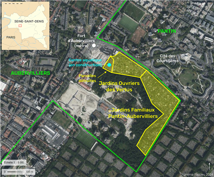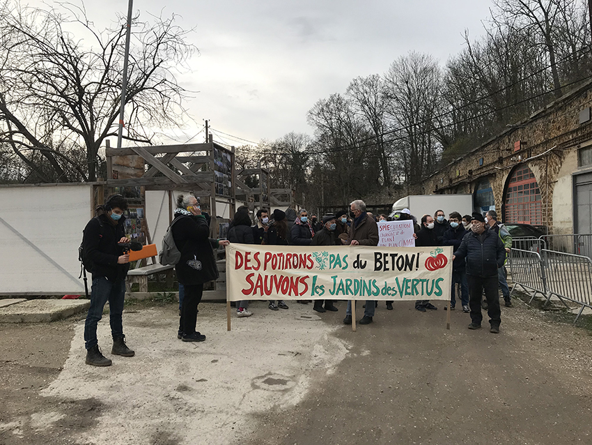 Winter 2021 in Aubervilliers, in the northern inner suburbs of Paris. Behind a building site, between gardens and a few old buildings, a group of gardeners and residents with placards chant slogans such as : “Rangez vos engins, laissez-nous les jardins !” (“Take away your machines, give us back our gardens !” ; and “Des potirons, pas du béton !” (“Squash, not cement !”). On this winter’s day, developer Grand Paris Aménagement came to present a project for a training pool for the Paris 2024 Olympic Games, which would require the destruction of several plots of community gardens (allotments) known as the Jardins Ouvriers des Vertus, created in 1935 at the initiative of a local association. Faced with the influx of demonstrators—and following their intrusion into the room booked for the occasion—the meeting was postponed.